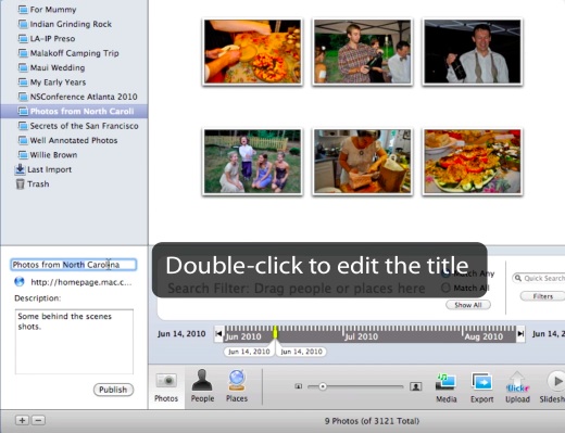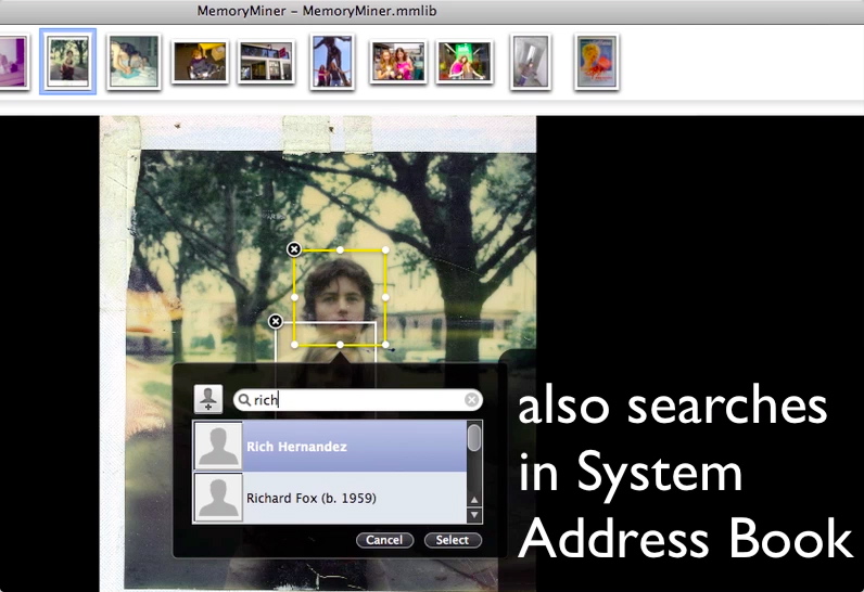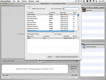 MemoryMiner is a great complement to iPhoto or other photo management applications such as Lightroom or Aperture. However, you can happily use MemoryMiner all by itself. Whenever you import a photo into MemoryMiner it will reuse as much descriptive data that may already exist about each photo. Typical sources of this data are the file itself, which could have dates, titles, captions, place names, etc. embedded in the files using any of the EXIF/IPTC/XMP standards. If the photo is being managed by iPhoto, MemoryMiner will ask iPhoto what it knows, including face information.