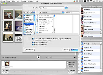 MemoryMiner uses an embedded relational database (sqlite) to store all descriptive data (aka metadata) about the photos, people and places in your library. By default, all photos you import are imported by reference. No copy is made, so they continue to be stored wherever they were when you imported them, whether that's on a hard drive, CD ROM, or DVD ROM. MemoryMiner uses a "library document" (using the ".mmlib" file extension) which is actually a folder containing the database, and some other supporting files such as the thumbnail versions of your photos. You can therefore create multiple libraries in the same way that a word processor can load multiple documents. You can only have one library loaded at a time. When you first run MemoryMiner it creates a library document in your home folder's "Documents" folder. An example location: